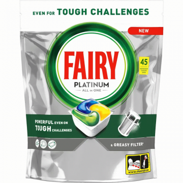 Fairy konetiskitabletti (45 kpl/pkt) on tehokas ja helppokäyttöinen konetiskitabletti, joka on suunniteltu poistamaan rasvaa, pinttyneitä ruokajäämiä ja likaa koneellisessa astianpesussa. Fairy-tuoteperheessä 45 kappaleen pakkaukset löytyvät yleisimmin Platinum / Platinum Plus All in One -sarjasta, jossa korostuvat vahva puhdistusteho, rasvanpoisto ja hyvä lopputulos ilman esihuuhtelua.
