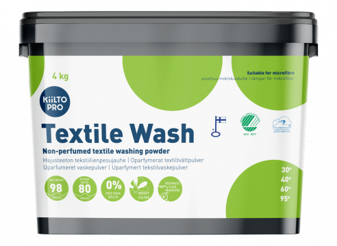 Kiilto Pro Textile Wash on hajusteeton ja erittäin tehokas tekstiilienpesujauhe ammattikäyttöön. Se on suunniteltu pesemään värilliset ja mikrokuitutekstiilit perusteellisesti ja hellävaraisesti lämpötila-alueella 30 – 95 °C. Pesuaine sisältää innovatiivisen ligniinibiopolymeerin, joka korvaa perinteiset fossiiliset aineet ilman pesutuloksen heikkenemistä ja pienentää tuotteen ympäristöjalanjälkeä. Kiilto Pro Textile Wash ei sisällä fosforia, zeoliittia, kirkasteita, valkaisuaineita tai hajusteita, mikä tekee siitä erinomaisen valinnan allergia- ja herkkyysnäkökohdat huomioivaan käyttöön. Tuote on Nordic Swan Ecolabel -ympäristömerkitty ja sopii monipuoliseen ammattipesuun, kuten siivoustekstiilien, työvaatteiden ja mikrokuitupyyhkeiden pesuun.